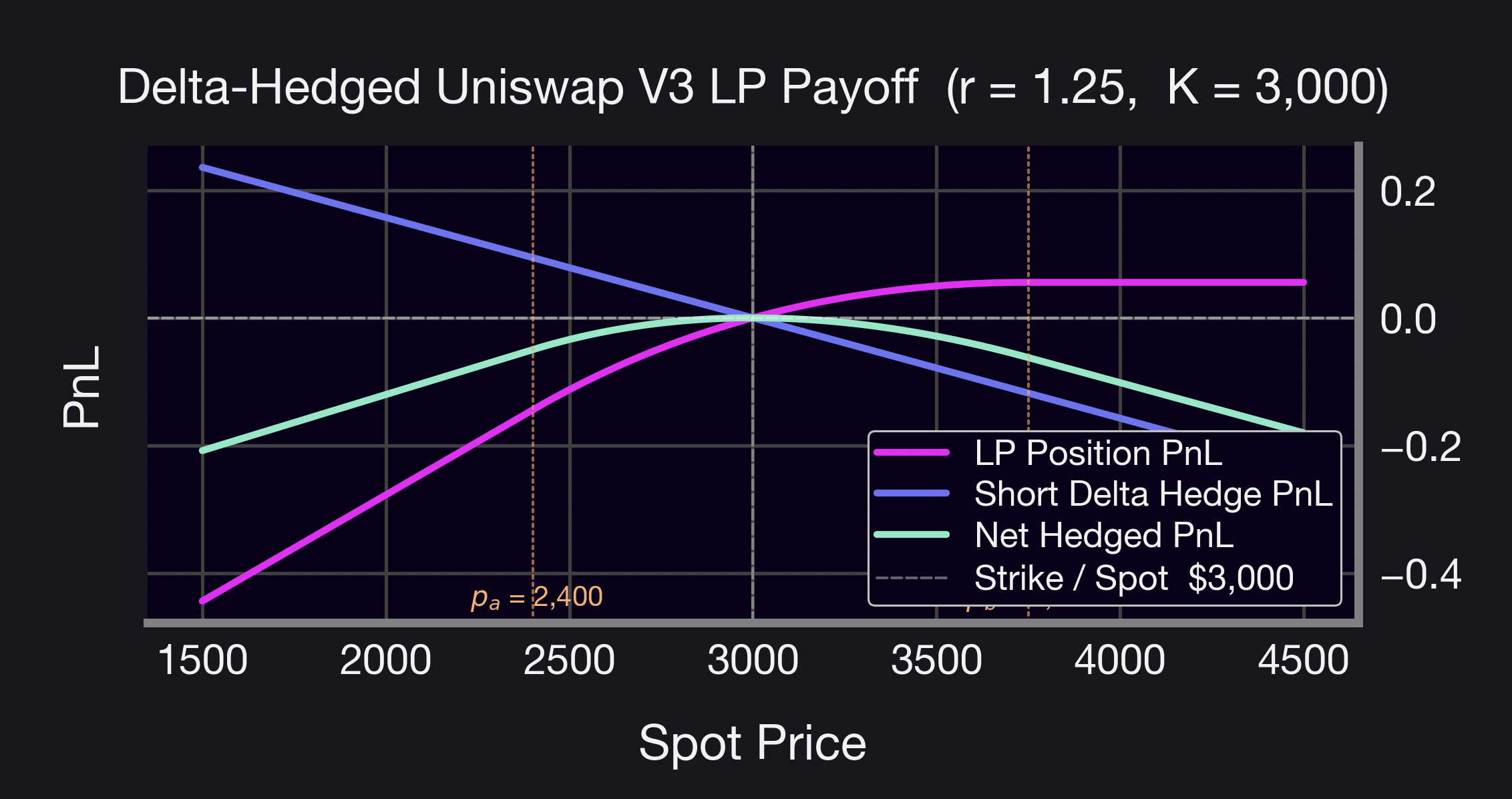 As a result, we simulate “rebalancing” the Panoption by closing out the position once the spot price leaves the target price range, re-entering a new position centred on the new spot price, and hedging the delta of the newly opened position. Assuming that the position is well delta-hedged at the time of rebalancing and ignoring gas costs, this process should incur no change in PnL.