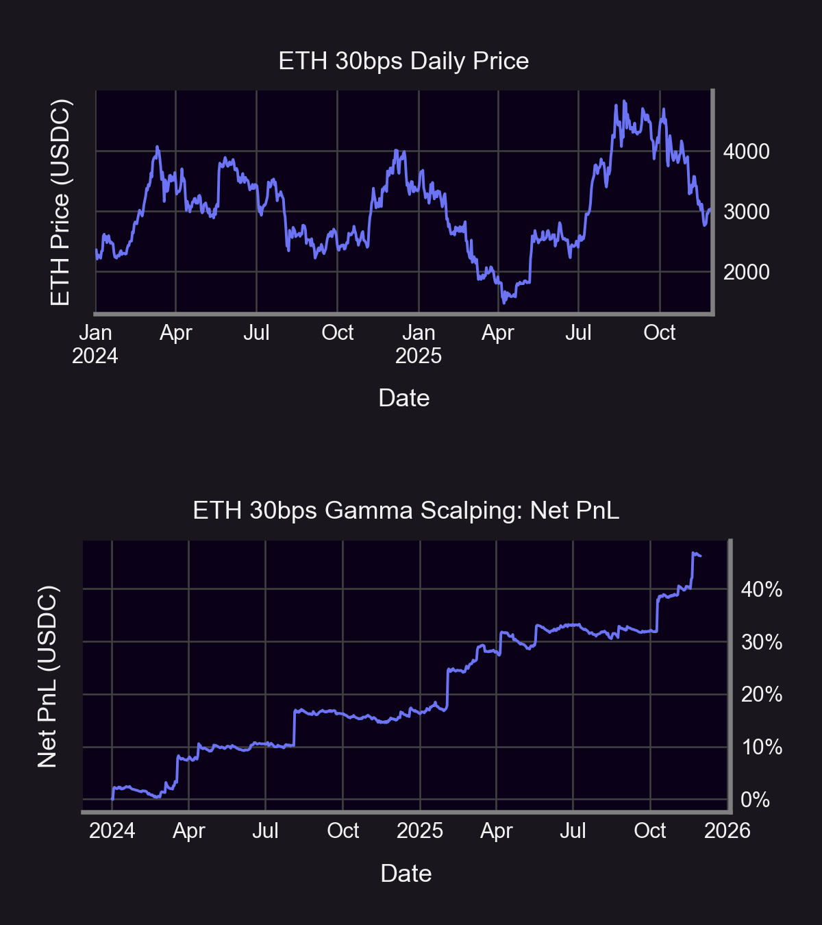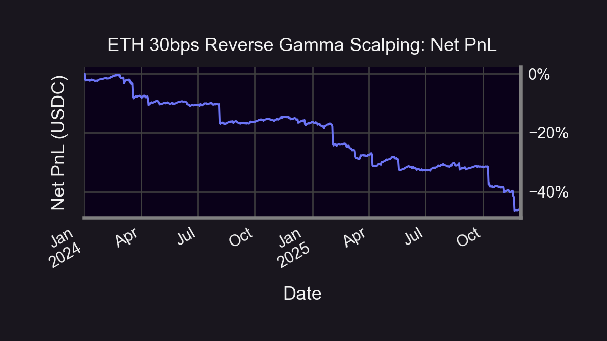 The lack of venues to trade the long convexity side leads to a systemic inefficiency that prevents LPs from being paid fairly. Two-sided markets enabling participation in long convexity positions are essential to correcting this inefficiency. A sample of this asymmetric dynamic at play is displayed in the below chart of illustrative PnL using theoretical mid prices, where a 46% loss is suffered when deploying a reverse gamma scalping strategy in the ETH-USDC 30bps pool from January 2024 to December 2025.