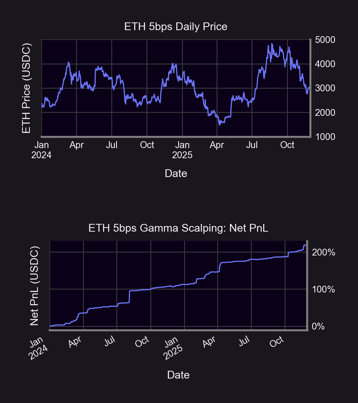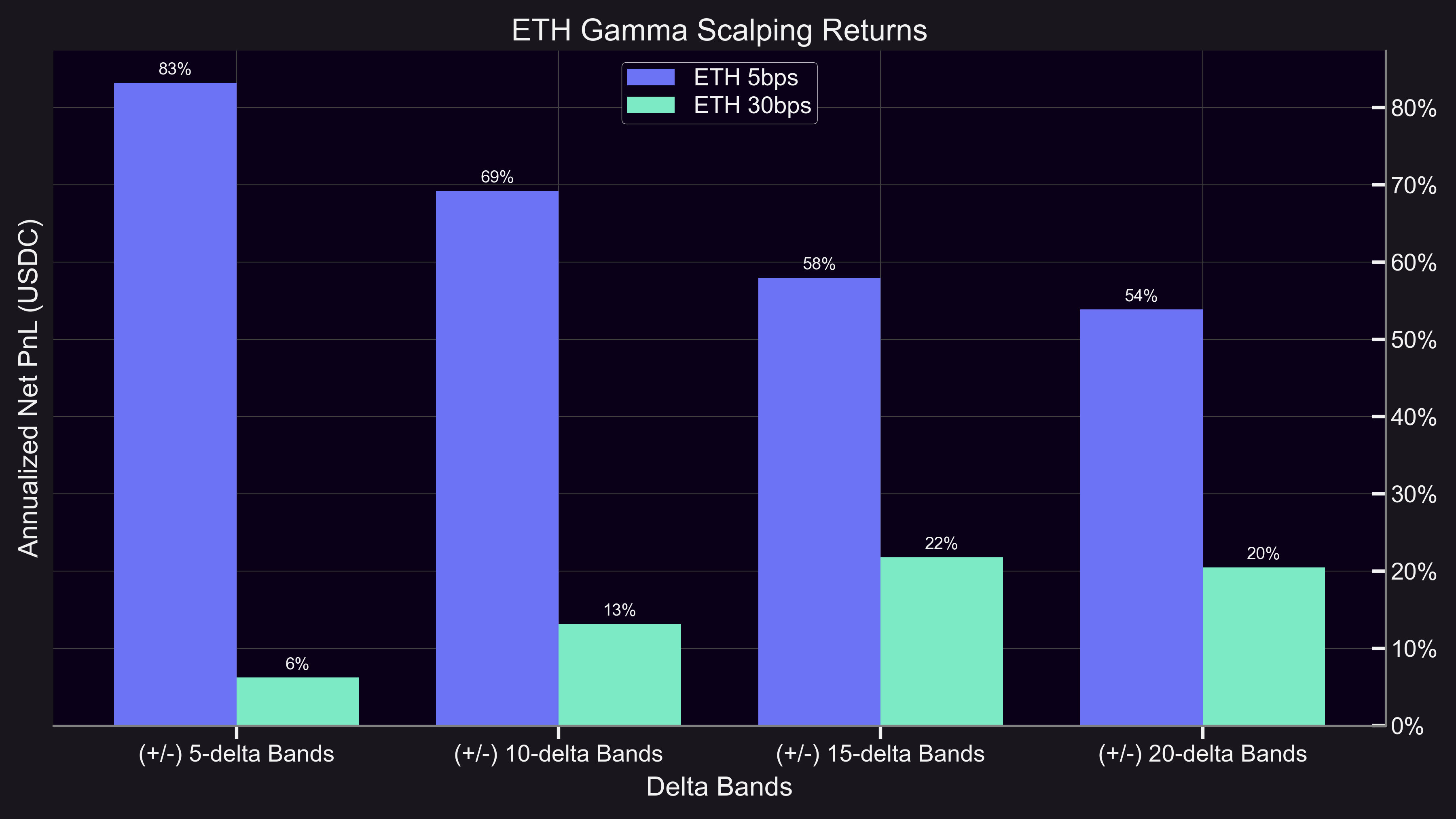 In the chart above, the theoretical cumulative net PnL collected by the trader due this 5bps pool gamma scalping tactic largely exhibits a stable, “stairstep” pattern. Conversely, the ETH pool price endures massive fluctuations throughout the same sample period. This underlying turbulence is reflected in a buy-and-hold strategy within the ETH 5bps pool yielding only 31% returns while gamma scalping produces a lofty 219% return. In this simulation, gamma scalping provided a dual advantage through stability amid volatile market conditions as well as a demonstrable amplification in simulated profits.