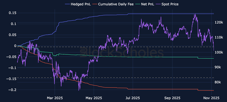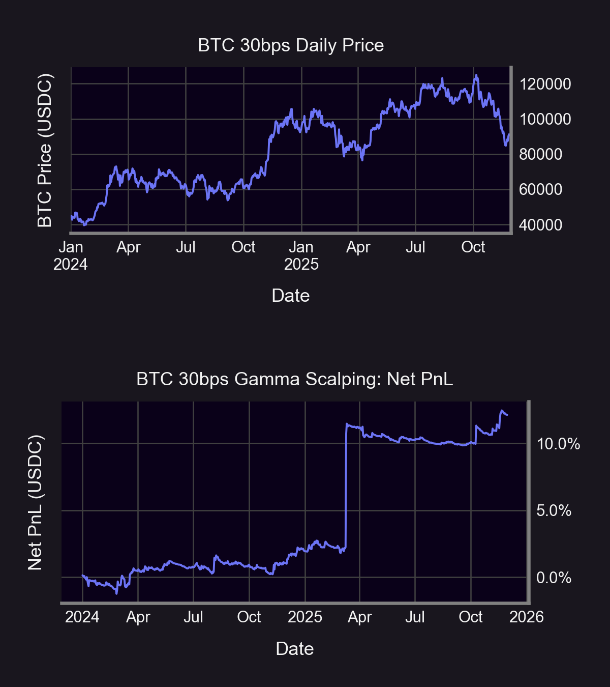 In contrast to the prior examples, the buy-and-hold return for BTC substantially outperformed the gamma-scalping return of 12% in the 30 bps pool. Simply holding WBTC over the same sample period yields a 105% return. This outcome illustrates the relationship between the supply of short-convexity through Uniswap LP positions and the effective “pricing” of volatility exposure.