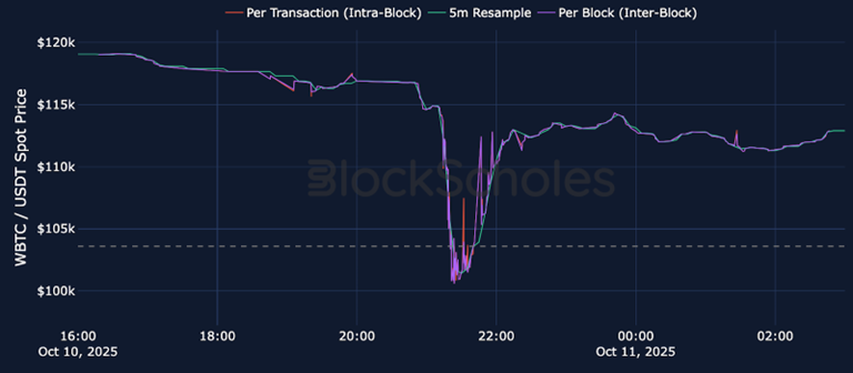 Further examination revealed an "intra-block" flash crash, where the spot price briefly traded back within the LP range and then returned above it before the end of the block. These trades within the range triggered the payment of fees on the long call Panoption, yet the rapid reversal meant no gamma-hedging was performed within the hour.
