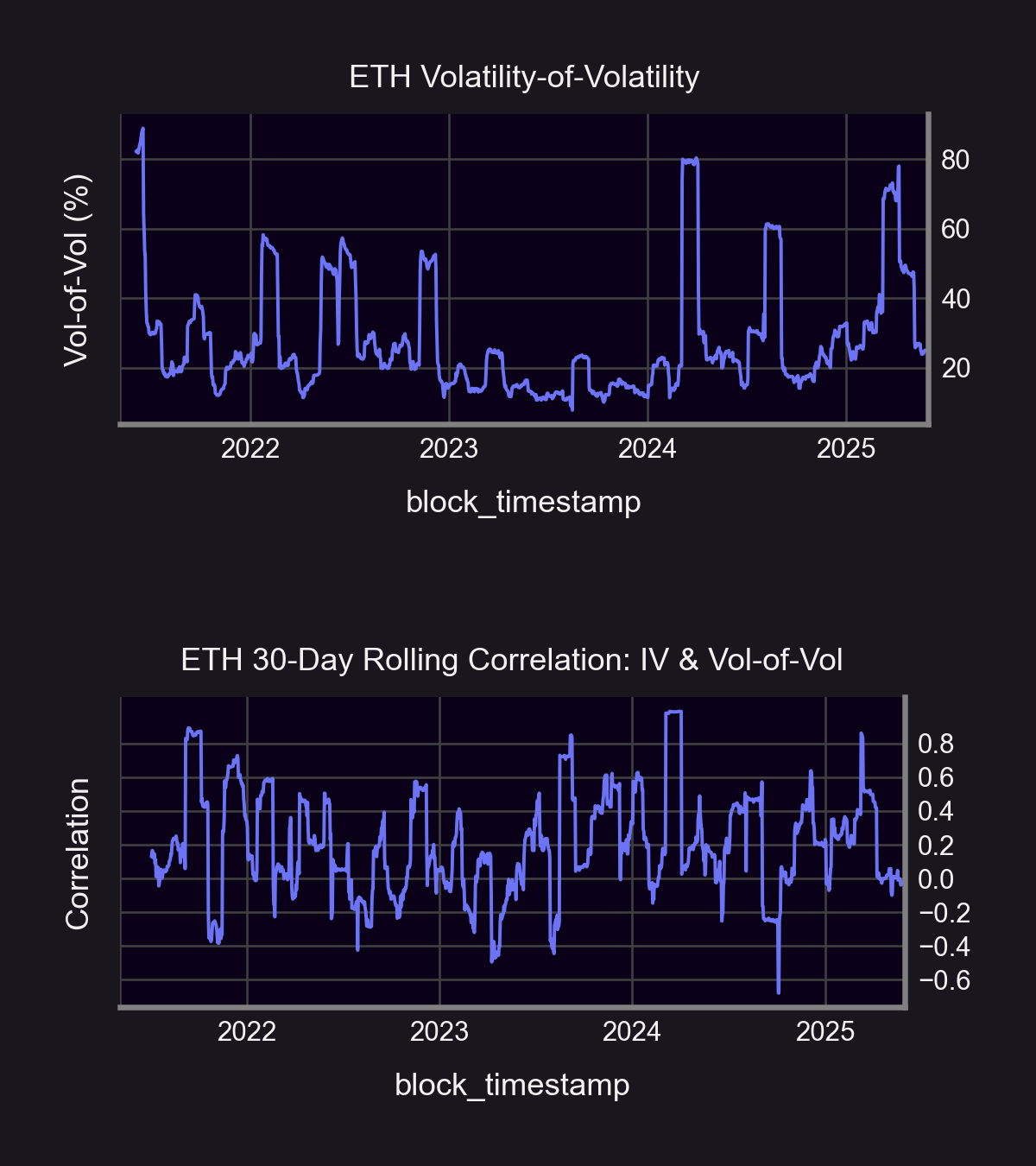 Spanning from May 2021 through May 2025, the above graphics showcase the rolling 30-day standard deviations of daily changes in the Uniswap IV for the ETH/USDC and WBTC/USDC pools as well as the rolling 30-day correlation between daily changes in Uniswap IVs and their respective rolling standard deviations during that time. While ETH and BTC each exhibit individual trends in terms of vol-of-vol, the correlation of IV to vol-of-vol of both assets occupy positive territory for a fairly sizable duration of the sample. The full sample correlations are 0.51 and 0.35, respectively, for ETH and BTC with ETH deviating more than BTC around the mean of 0. ETH also has a marginally higher vol-of-vol for the sample than BTC. These are all contributing factors to ETH being assessed with an elevated vol-of-vol risk premium.